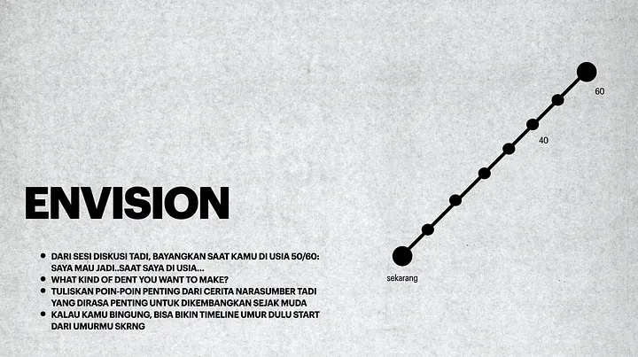 Pertanyaan pertama, para peserta diminta untuk menuliskan “jika saya di usia 50/60 nanti, saya mau menjadi..” bisa diisi dengan keadaan, profesi, state of mind, atau apapun.