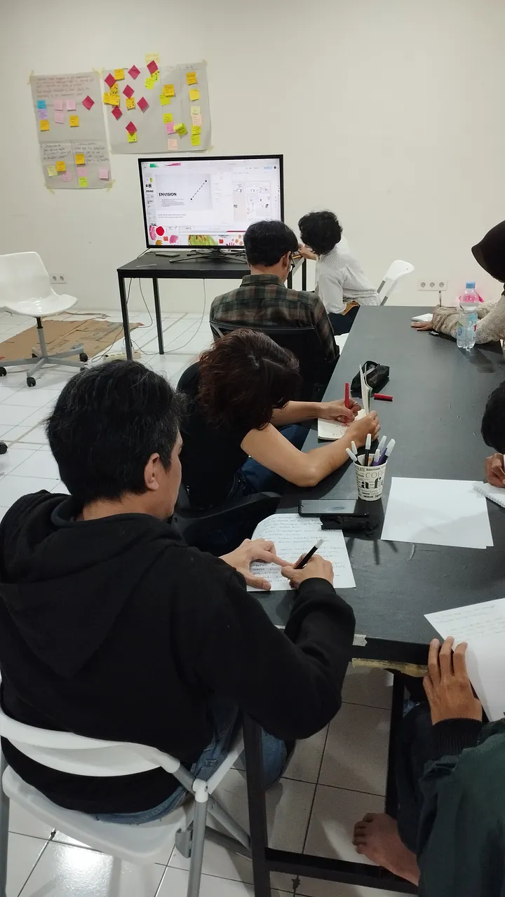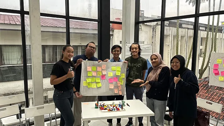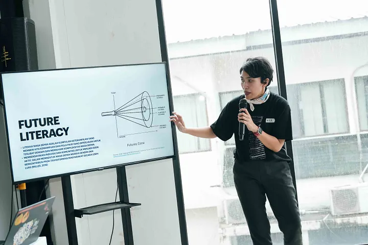 Setelah makan siang, barulah masuk ke Sesi Design Thinking Workshop. Kami, para fasilitator sudah menyiapkan berbagai keperluan pendukung sesi Design Thinking hari ini. Para peserta dibagi menjadi 4 kelompok, dengan total 5–6 orang di setiap kelompok. Sebelum sesi dimulai, kak Amanda Mita dari Labtek Indie memaparkan materi terlebih dahulu terkait Speculative Design. Speculative Design adalah sebuah pendekatan dalam desain yang berfokus pada eksplorasi kemungkinan masa depan untuk menciptakan solusi praktis.
